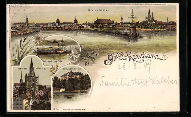 Lithographie Konstanz, Ortsansicht mit Bodensee-Dampfer