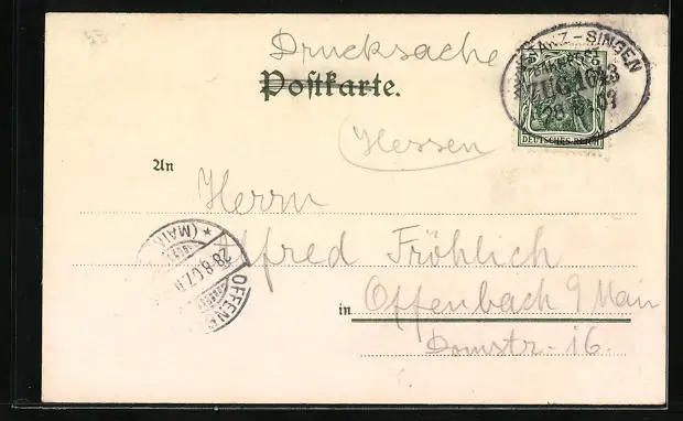 Personenbezogene Daten auf der Rückseite der Karte wurden durch blauen Textmarker unkenntlich gemacht. Die blauen Stellen sind auf die Vorderseite durchgeweicht und wirken sich negativ auf das Postkartenfoto aus