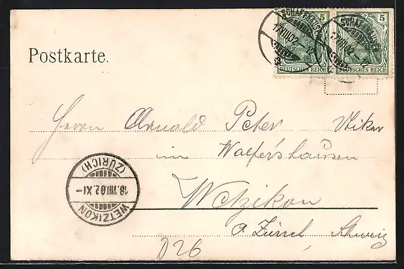 Personenbezogene Daten auf der Rückseite der Karte wurden durch blauen Textmarker unkenntlich gemacht. Die blauen Stellen sind auf die Vorderseite durchgeweicht und wirken sich negativ auf das Postkartenfoto aus