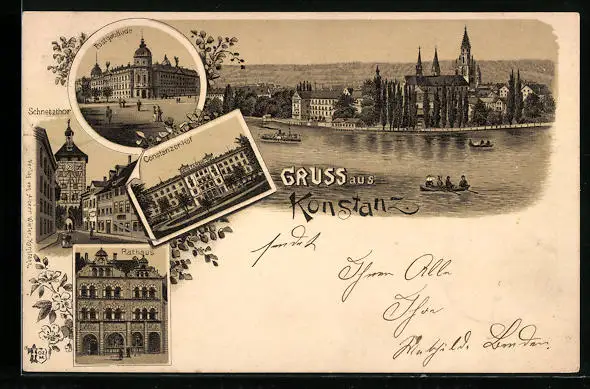 Lithographie Konstanz, Postgebäude, Schnetzthor, Rathaus