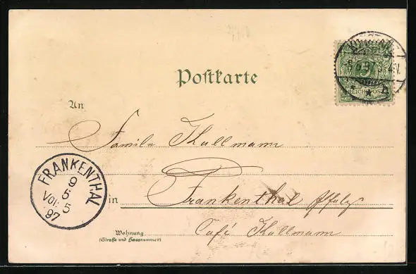 Personenbezogene Daten auf der Rückseite der Karte wurden durch blauen Textmarker unkenntlich gemacht. Die blauen Stellen sind auf die Vorderseite durchgeweicht und wirken sich negativ auf das Postkartenfoto aus