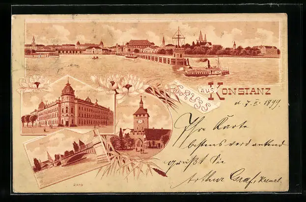 Lithographie Konstanz, Postgebäude, Schnetztor, Rheinbrücke