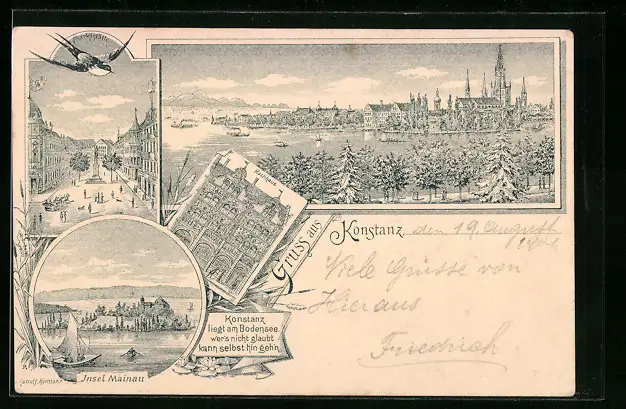 Lithographie Konstanz, Rathaus, Marktstätte, Insel Mainau