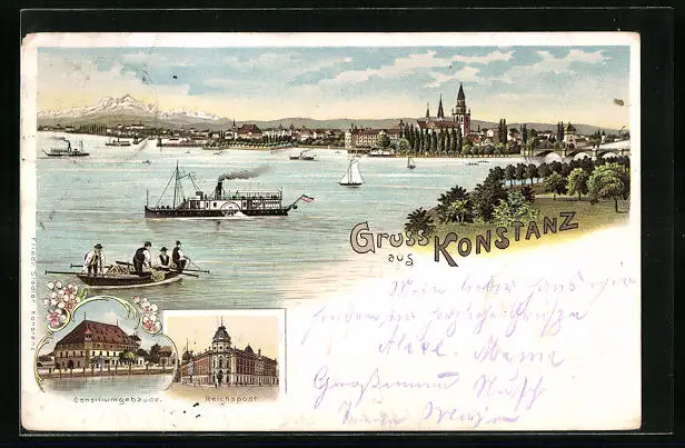 Lithographie Konstanz, Teilansicht mit Dampfer, Consiliumgebäude, Reichspost