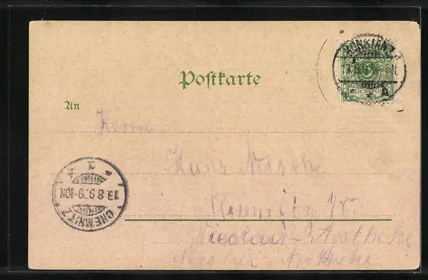 Personenbezogene Daten auf der Rückseite der Karte wurden durch blauen Textmarker unkenntlich gemacht. Die blauen Stellen sind auf die Vorderseite durchgeweicht und wirken sich negativ auf das Postkartenfoto aus