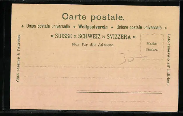 Personenbezogene Daten auf der Rückseite der Karte wurden durch blauen Textmarker unkenntlich gemacht. Die blauen Stellen sind auf die Vorderseite durchgeweicht und wirken sich negativ auf das Postkartenfoto aus