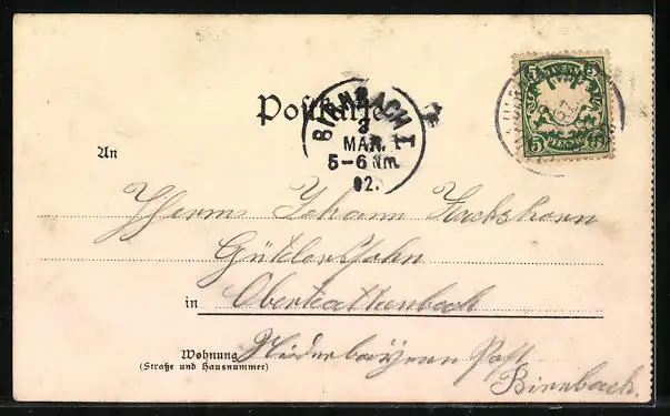 Personenbezogene Daten auf der Rückseite der Karte wurden durch blauen Textmarker unkenntlich gemacht. Die blauen Stellen sind auf die Vorderseite durchgeweicht und wirken sich negativ auf das Postkartenfoto aus