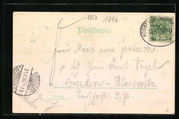 Personenbezogene Daten auf der Rückseite der Karte wurden durch blauen Textmarker unkenntlich gemacht. Die blauen Stellen sind auf die Vorderseite durchgeweicht und wirken sich negativ auf das Postkartenfoto aus