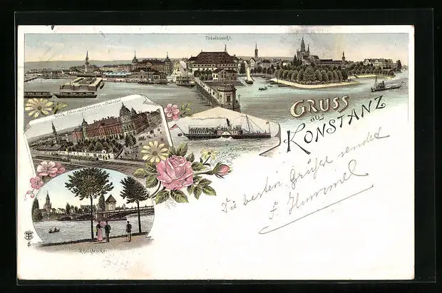 Lithographie Konstanz, Totalansicht, Rheinbrücke