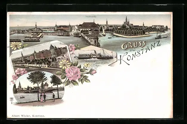 Lithographie Konstanz, Totalansicht, Rheinbrücke