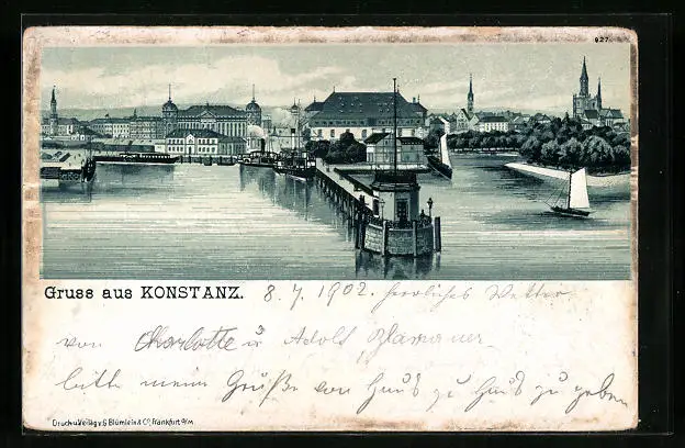 Lithographie Konstanz, Totalansicht mit Hafenpartie