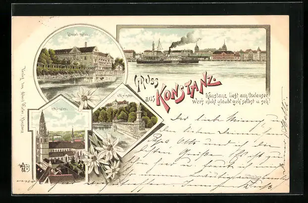 Lithographie Konstanz, Totalansicht mit Münster und Mainau