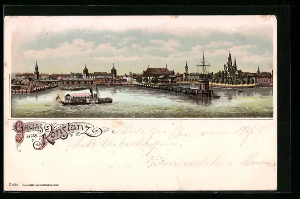 Lithographie Konstanz, Uferpartie mit Dampfer