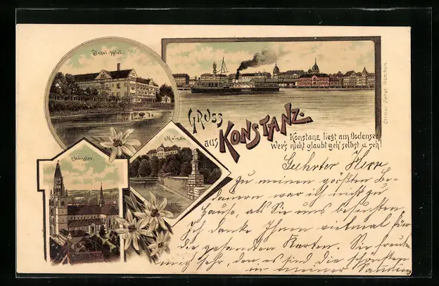 Lithographie Konstanz am Bodensee, Insel-Hotel, Münster, Mainau