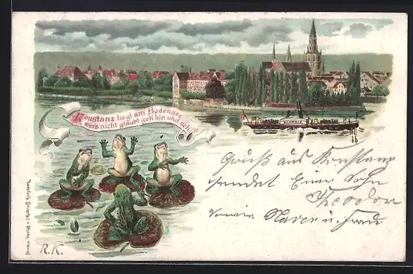 Lithographie Konstanz am Bodensee, Teilansicht u. Frösche auf Seerosenblättern