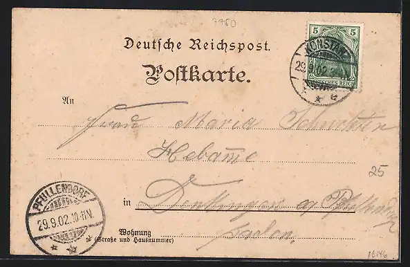 Personenbezogene Daten auf der Rückseite der Karte wurden durch blauen Textmarker unkenntlich gemacht. Die blauen Stellen sind auf die Vorderseite durchgeweicht und wirken sich negativ auf das Postkartenfoto aus