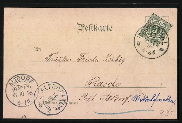 Personenbezogene Daten auf der Rückseite der Karte wurden durch blauen Textmarker unkenntlich gemacht. Die blauen Stellen sind auf die Vorderseite durchgeweicht und wirken sich negativ auf das Postkartenfoto aus