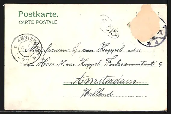 Personenbezogene Daten auf der Rückseite der Karte wurden durch blauen Textmarker unkenntlich gemacht. Die blauen Stellen sind auf die Vorderseite durchgeweicht und wirken sich negativ auf das Postkartenfoto aus