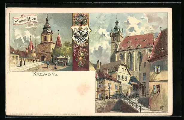 Lithographie Krems a. d. D., Steiner Tor, Kirche, Wappen