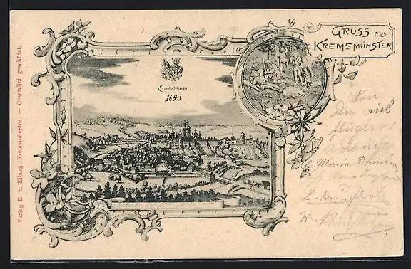 Lithographie Kremsmünster, Ortsansicht aus der Vogelschau