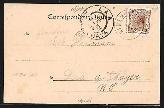 Personenbezogene Daten auf der Rückseite der Karte wurden durch blauen Textmarker unkenntlich gemacht. Die blauen Stellen sind auf die Vorderseite durchgeweicht und wirken sich negativ auf das Postkartenfoto aus