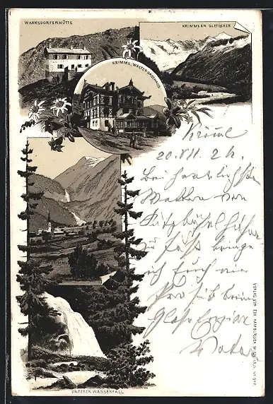 Lithographie Krimml, Waltls Gasthaus, Warnsdorferhütte, Krimmler Gletscher, Unterer Wasserfall
