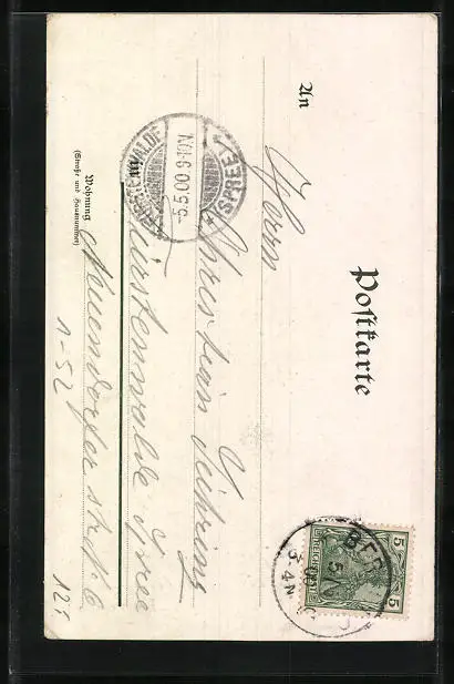 Personenbezogene Daten auf der Rückseite der Karte wurden durch blauen Textmarker unkenntlich gemacht. Die blauen Stellen sind auf die Vorderseite durchgeweicht und wirken sich negativ auf das Postkartenfoto aus