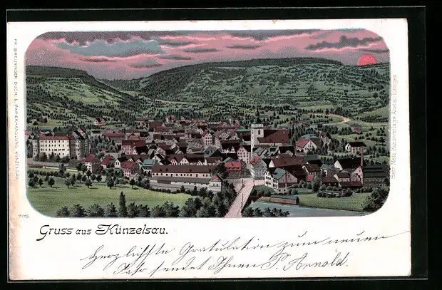 Lithographie Künzelsau, Teilansicht mit Kirche