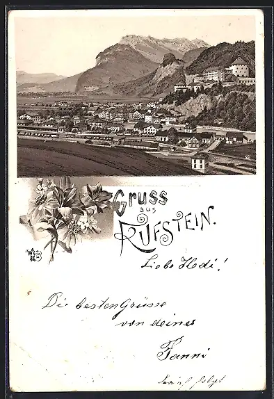 Lithographie Kufstein, Ortsansicht mit Festung und Gebirge