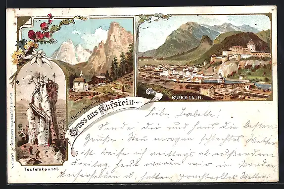 Lithographie Kufstein, Teufelskanzel, Ortsansicht