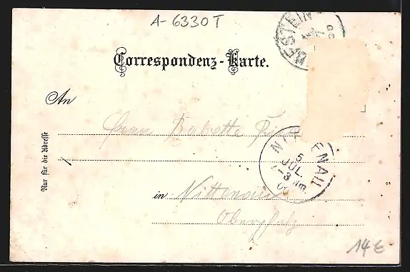 gelaufen 1900, Eckknick re. unten, Briefmarke entfernt, rückseitig Oberflächenschaden, guter Zustand