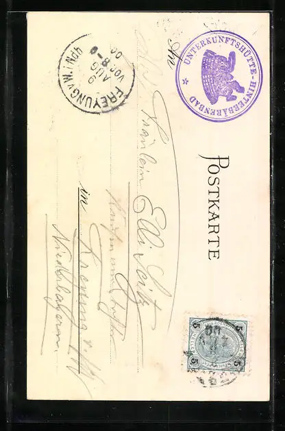 Personenbezogene Daten auf der Rückseite der Karte wurden durch blauen Textmarker unkenntlich gemacht. Die blauen Stellen sind auf die Vorderseite durchgeweicht und wirken sich negativ auf das Postkartenfoto aus