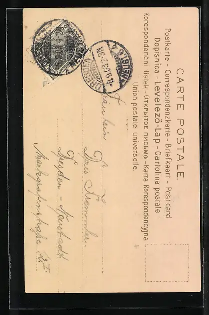 Personenbezogene Daten auf der Rückseite der Karte wurden durch blauen Textmarker unkenntlich gemacht. Die blauen Stellen sind auf die Vorderseite durchgeweicht und wirken sich negativ auf das Postkartenfoto aus