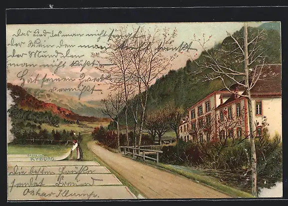 Lithographie Kyburg, Ortspartie und Frau mit Laken