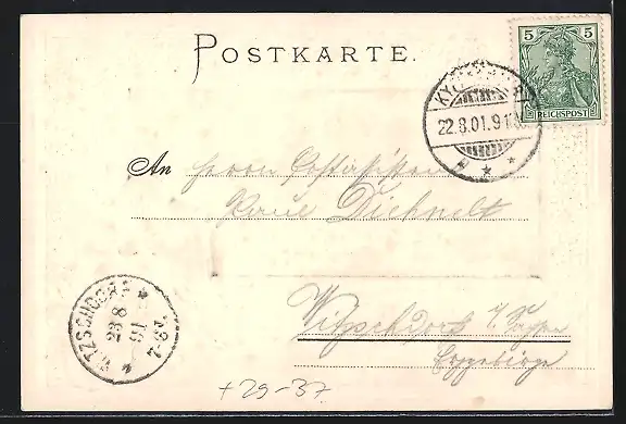 gelaufen 1901, Eckknick oben li., guter Zustand