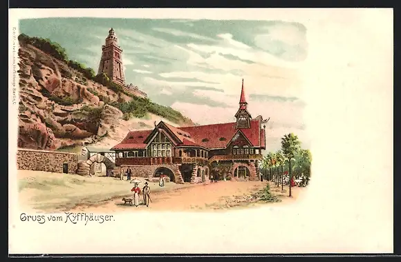 Lithographie Kyffhäuser, Gasthaus, Denkmal