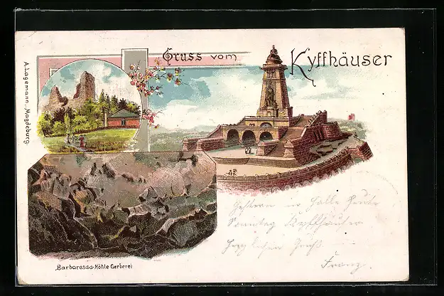 Lithographie Kyffhäuser, Kaiser Wilhelm-Denkmal, Barbarossa Höhle - Gerberei, Ruine