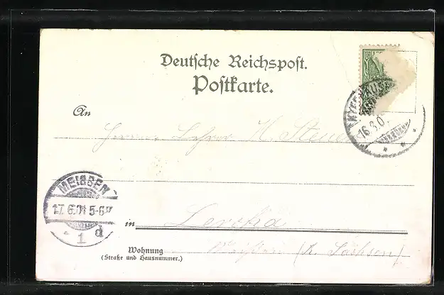 Personenbezogene Daten auf der Rückseite der Karte wurden durch blauen Textmarker unkenntlich gemacht. Die blauen Stellen sind auf die Vorderseite durchgeweicht und wirken sich negativ auf das Postkartenfoto aus