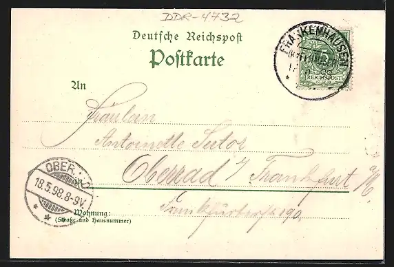 Personenbezogene Daten auf der Rückseite der Karte wurden durch blauen Textmarker unkenntlich gemacht. Die blauen Stellen sind auf die Vorderseite durchgeweicht und wirken sich negativ auf das Postkartenfoto aus