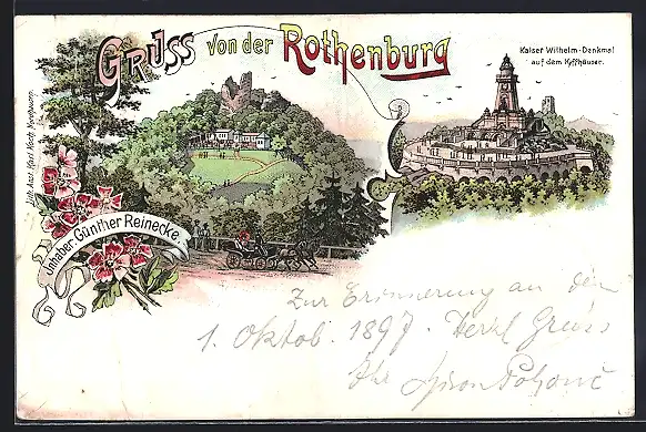 Lithographie Kyffhäuser, Kaiser Wilhelm-Denkmal auf dem Kyffhäuser, Rothenburg