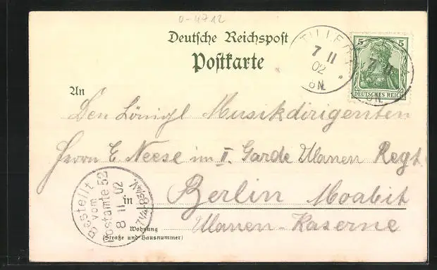 Personenbezogene Daten auf der Rückseite der Karte wurden durch blauen Textmarker unkenntlich gemacht. Die blauen Stellen sind auf die Vorderseite durchgeweicht und wirken sich negativ auf das Postkartenfoto aus