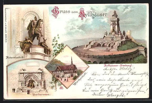 Lithographie Kyffhäuser, Kyffhäuser-Denkmal, Reiterstandbild, Barbarossa, Wirtschaft