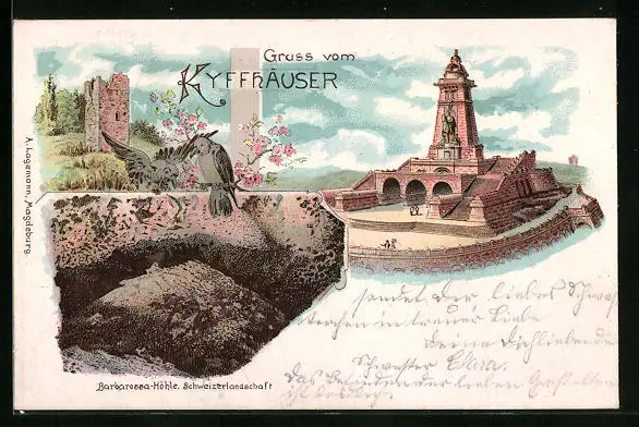 Lithographie Kyffhäuser, Kyffhäuser-Denkmal, Ruine, Schweizerlandschaft mit Barbarossa-Höhle