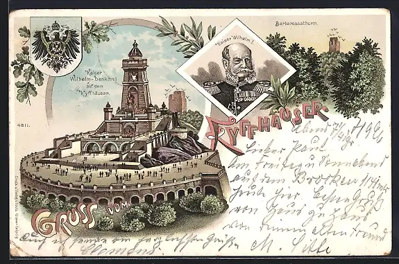 Lithographie Kyffhäuser, Portrait Kaiser Wilhelm I. & Denkmal, Barbarossathurm