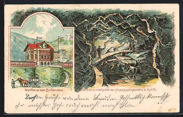 Lithographie Kyffhäuser / Thüringen, Barbarossahöhle Inneres, Gasthaus