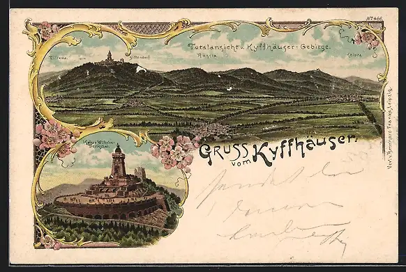 Lithographie Kyffhäuser, Totalansicht mit Gebirge, Kaiser-Wilhelm-Denkmal