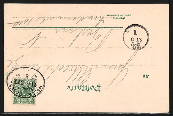 Personenbezogene Daten auf der Rückseite der Karte wurden durch blauen Textmarker unkenntlich gemacht. Die blauen Stellen sind auf die Vorderseite durchgeweicht und wirken sich negativ auf das Postkartenfoto aus