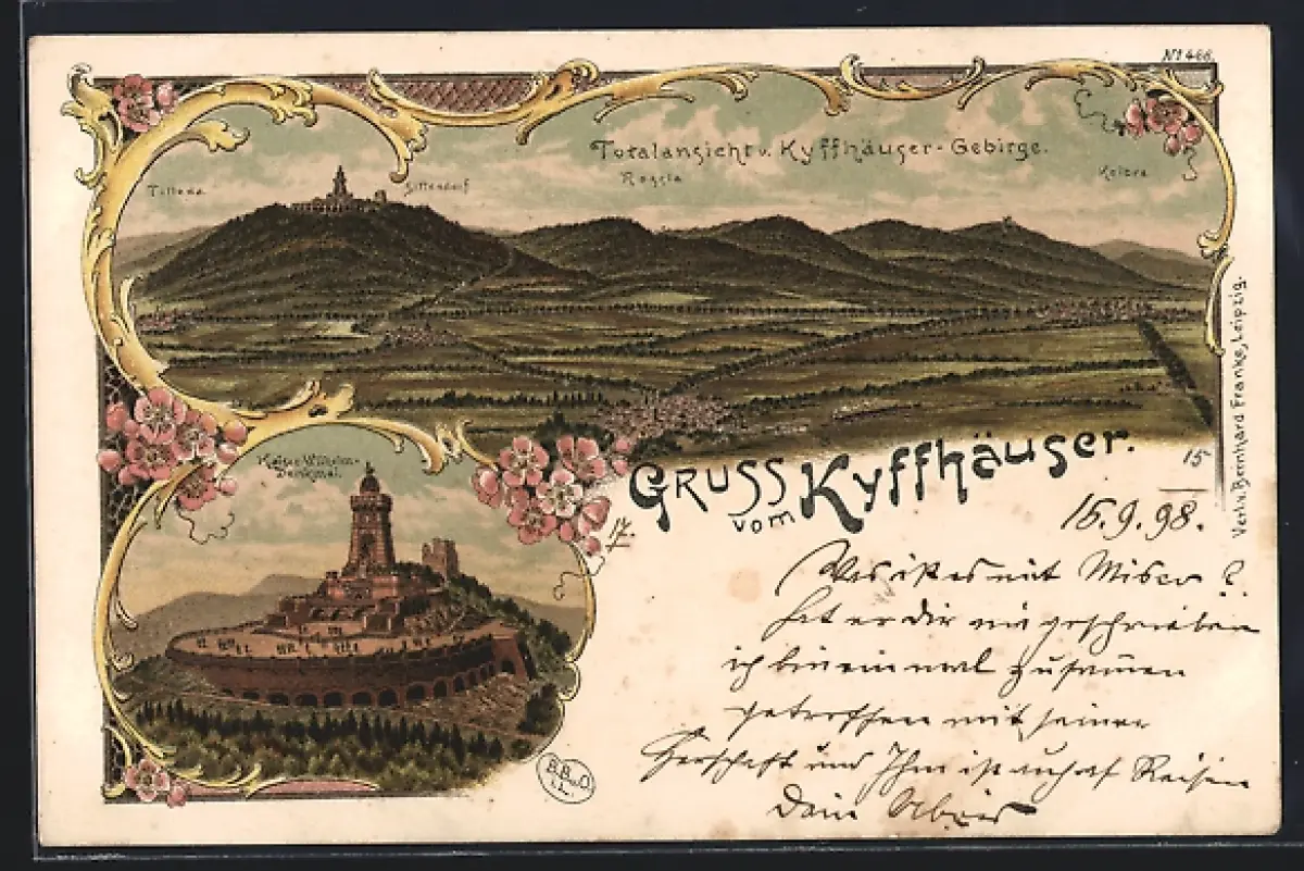 Lithographie Kyffhäuser, Totale mit Sittendorf, Kaiser Wilhelm-Denkmal