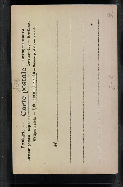 Personenbezogene Daten auf der Rückseite der Karte wurden durch blauen Textmarker unkenntlich gemacht. Die blauen Stellen sind auf die Vorderseite durchgeweicht und wirken sich negativ auf das Postkartenfoto aus