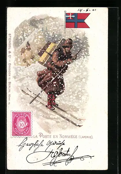 Lithographie La Poste en Norwège, Postbote auf Skiern